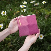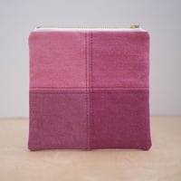 This zipper pouch features a patchwork of pinky-purple hues, ranging from cool pinks to juicy raspberry. Each piece is naturally dyed - the top squares are dyed with cochineal, and the bottom squares are dyed with cochineal and iron.